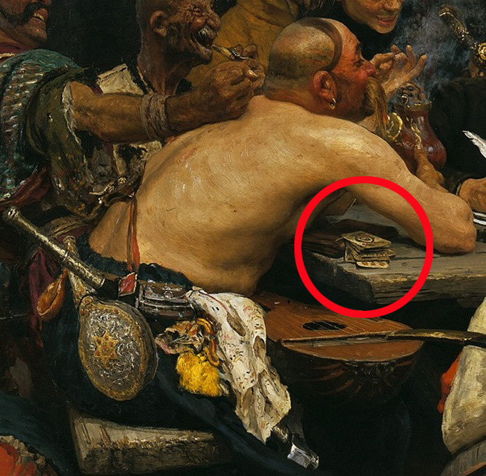 А я замечу: Почему искусствоведы нашли ответ на этот вопрос. И не нашли (или не искали) ответа на вопрос: Почему на пороховнице, закреплённой на поясе этого казака (казака - еврея?) изображён один из символов Израиля – шестиконечный золочёный Моген Давид (Звезда Давида)? Ведь эта деталь картины гораздо крупнее и колоритнее, чем колода карт.