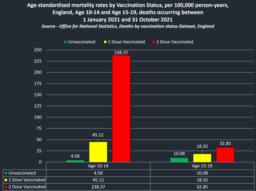 Уже смертность подростков пугает – у вакцинированных она в 2 раза выше, чем у не вакцинированных, а у вакцинированных двумя дозами – смертность выше в 3 раза! Но в реальный ужас приводят числа в группе детей 10-14 лет: у вакцинированных одной дозой она в 10 раза выше, чем у не вакцинированных, а у вакцинированных двумя дозами смертность выше в 52 раза!