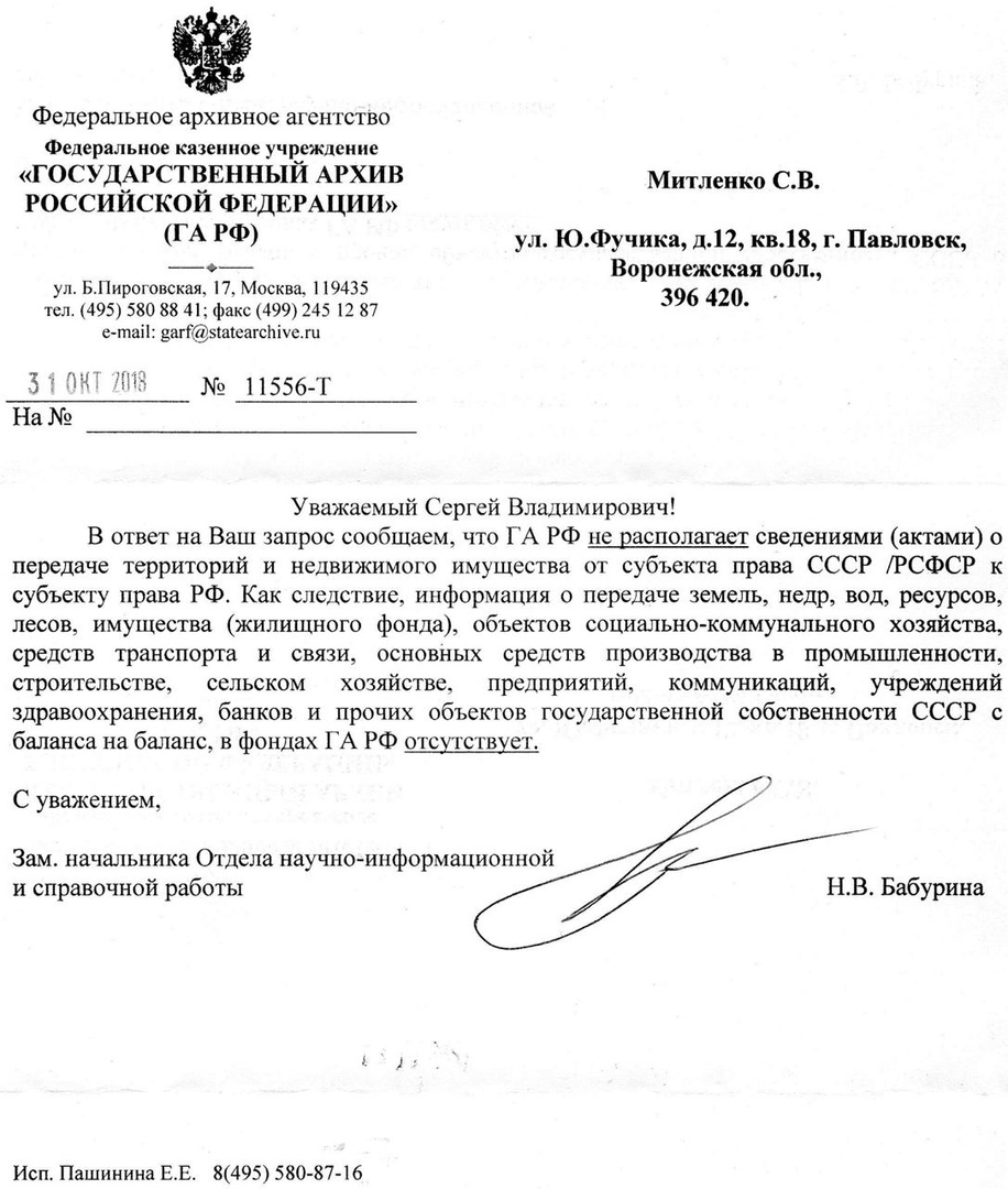 2.Территория СССР и ее имущество из юрисдикции СССР не передавалась к РФ, о чем свидетельствуют ответы Госархивов РФ, а также Определение Судебной Коллегии по экономическим спорам Верховного Суда РФ от 13 октября 2022 г. N 301-ЭС22-2640 по делу N А31-15546/2018: